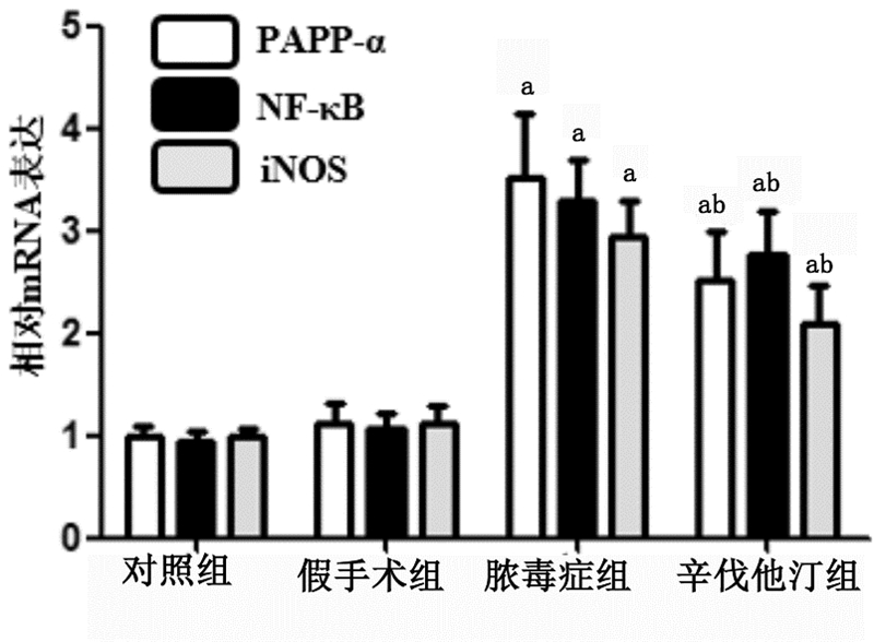 从RT-PCR结果中可以看出,假手术组与对照组之间的差异无统计学意义;脓毒症组iNOS、PPAR-α和NF-κB的mRNA水平显著高于对照组(P<0.01);辛伐他汀组iNOS、PPAR-α和NF-κB的mRNA水平比对照组高(P<0.01),但显著低于脓毒症组(P<0.01),见图3。提示,脓毒血症能促进iNOS、PPAR-α和NF-κB的mRNA的表达,而辛伐他汀预处理能逆转脓毒症上调的iNOS、PPAR-α和NF-κB的mRNA水平。