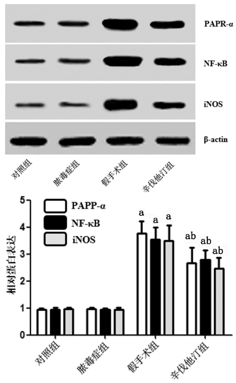 与对照组相比,假手术组NF-κB、PPAR-α和iNOS 蛋白表达水平差异无统计学意义;脓毒症组3种蛋白表达显著高于对照组(P<0.01),辛伐他汀组3种蛋白表达相比与脓毒症组显著受到抑制(P<0.01),见图4。提示辛伐他汀能抑制PPAR-α和NF-κB蛋白表达,减少iNOS表达。