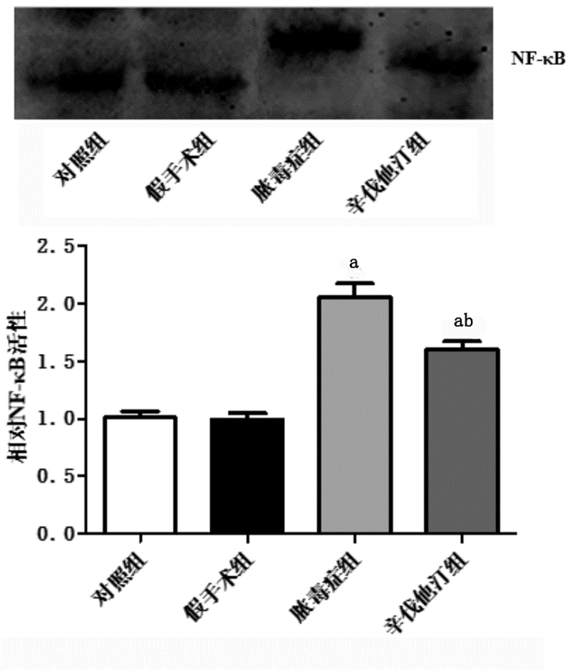 与对照组相比,假手术组NF-κB活性差异无统计学意义;脓毒症组NF-κB显著滞后,活性高于对照组(P<0.01);辛伐他汀组与脓毒症组相比NF-κB活性显著受到抑制(P<0.01),见图5。提示辛伐他汀能抑制NF-κB活性。