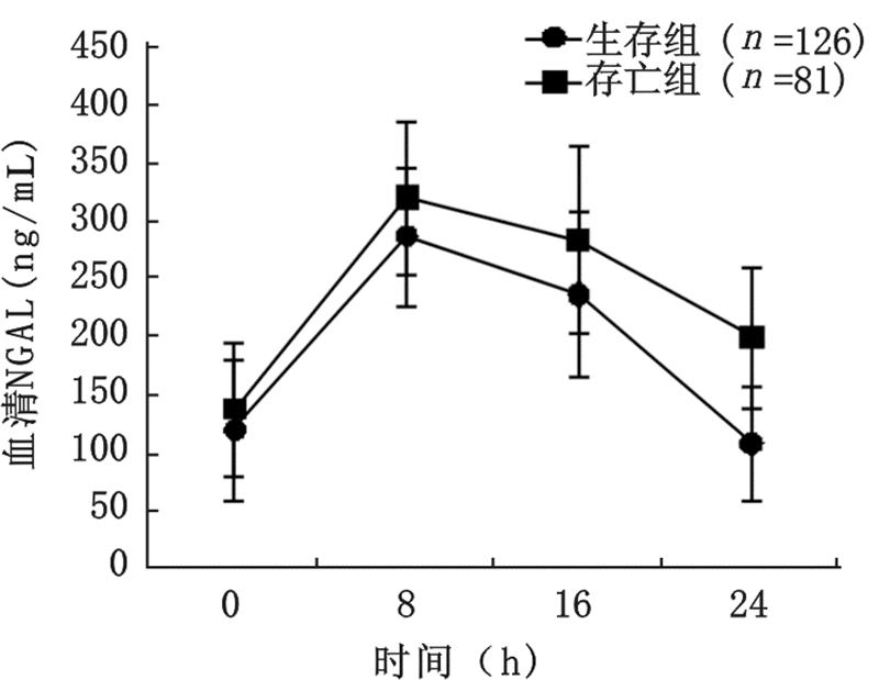 2.5 CBP治疗对CSA-AKI患者NGAL的影响两组患者行CBP治疗的过程中,虽然在8 h时,NGAL水平出现轻度的上升,但随后呈逐渐下降趋势。CBP过程中超滤液中NGAL浓度介于(16.94~22.68)ng/mL之间。此外,CBP后,死亡组NGAL浓度(200.13±61.25)ng/mL显著高于生存组(108.27±49.14)ng/mL,t=2.053,P=0.041,见图1。