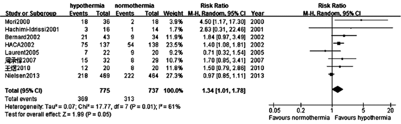 8项研究共纳入患者1 512例,其中治疗性低温组775例,良好神经功能预后369例;常温组737例,良好神经功能预后313例。与常温组比较,治疗性低温能改善患者神经功能预后,差异具有统计学意义(RR=1.34,95%CI:1.01~1.78;P < 0.05)。Meta分析结果显示8项研究间异质性较大(P=0.01,I2=61%),故采用随机效应模型分析。见图2。