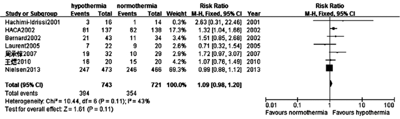 7项研究共纳入患者1 464例,其中治疗性低温组743例,存活394例;常温组721例,存活354例。与常温组比较,治疗性低温组患者存活率的差异无统计学意义(RR=1.09,95% CI:0.98~1.20;P>0.05)。Meta分析结果显示7项研究同质性较好(P=0.11,I2=43%),故采用固定效应模型分析。见图3。