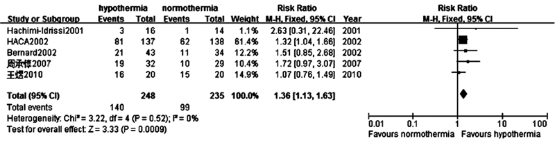 应用传统降温方法的治疗性低温组的5项研究共纳入患者483例,其中治疗性低温组248例,存活140例;常温组235例,存活99例。与常温组比较,应用传统降温方法的治疗性低温能提高患者存活率,差异具有统计学意义。(RR=1.36,95%CI:1.13~1.63;P < 0.01)。同时显示5项研究同质(P=0.52,I2=0%)。故采用固定效应模型分析。见图5。