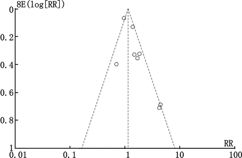 用倒漏斗图来检验发表文献的发表偏倚,纳入研究的文献在漏斗图中以RR值为中心散开分布,呈倒漏斗形,表明无明显的发表偏倚。见图6。