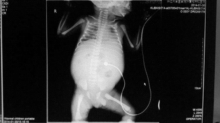 出生后24 h行剖腹探查术,发现腹腔内大量气体和淡黄绿色粪性腹水共约800 mL,肠管大网膜广泛粘连、大量钙化纤维块形成、小肠距屈氏韧带约2.5 cm处肠管坏死穿孔、近端肠管水肿淤血伴扩张、断端大便漏出。处理:近端小肠穿孔处于左下腹壁造瘘、腹腔冲洗并留置引流管,术后诊断MP。术后禁食、胃肠减压、腹腔引流、全静脉营养、抗感染、输血和切口换药等支持治疗,术后腹部感染严重,切口裂开并有大量黄绿色粪液流出。术后15 d二次剖腹探查,发现仅十二指肠血供尚可、其余肠管全部坏死,行坏死肠管切除、屈氏韧带处结扎十二指肠,术后持续如前对症支持治疗,但仍存在切口感染和排出十二指肠液。术后41 d第3次剖腹探查:发现腹腔内粘连严重、十二指肠水平部破裂,行粘连分离、沿破裂处切除远端肠管、荷包缝合十二指肠水平部并在上腹部造瘘,术后同上支持对症治疗。患儿全肠切除术后持续胃肠外营养,现18个月龄,体质量12 kg,智力体格发育无明显异常,等待肠移植。家属一直积极联系国外医院希望转运并进行肠移植手术,目前仍在等待中。