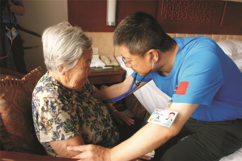 8月20日至21日,抗战老同志集中抵京报到期间,随车医护人员按照乘车编组对应接站。8月20日至9月5日,抗战老同志在酒店入住期间,随车医护人员实行24小时责任医师和责任护士值班备勤制。每日上午和夜间,带领生活护理人员与驻点医疗队开展联合巡诊,观察精神状态、血糖、饮食、睡眠等状况并记录,对特殊需求的老同志做好个体化诊疗,并参与分管抗战老同志的生活护理工作。每日下午16时前,收集汇总前24小时分管抗战老同志健康状况和医疗护理工作情况,以日报形式上报楼层医务室和领队。遇有健康情况异常或复杂病情,要严密观察,及时向楼层医务室上报,或请求诊疗中心专家会诊,采取相应处理措施。每日随车医疗队领队随机对医疗保健和生活护理工作现场巡视检查,参加每晚抗战老同志指挥保障组工作例会。遇突发紧急情况,第一时间联系楼层医务室,同时报告抗战老同志指挥保障组;如伤病情较重,立即转送至诊疗中心,接受专家组进一步诊疗,视情后送定点医院住院治疗。