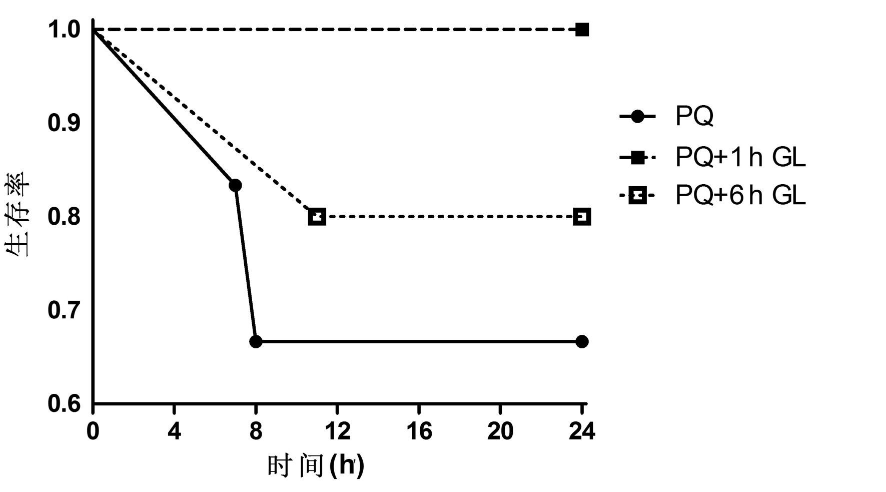 | 图 1 PQ组、PQ+1 h GL组和PQ+6 h GL组生存率比较(对数秩检验,χ2=2.355;P>0.05) Figure 1 Comparision of survival rate among PQ group,PQ+1 h GL group and PQ+6 h GL group (χ2=2.355;P>0.05) |