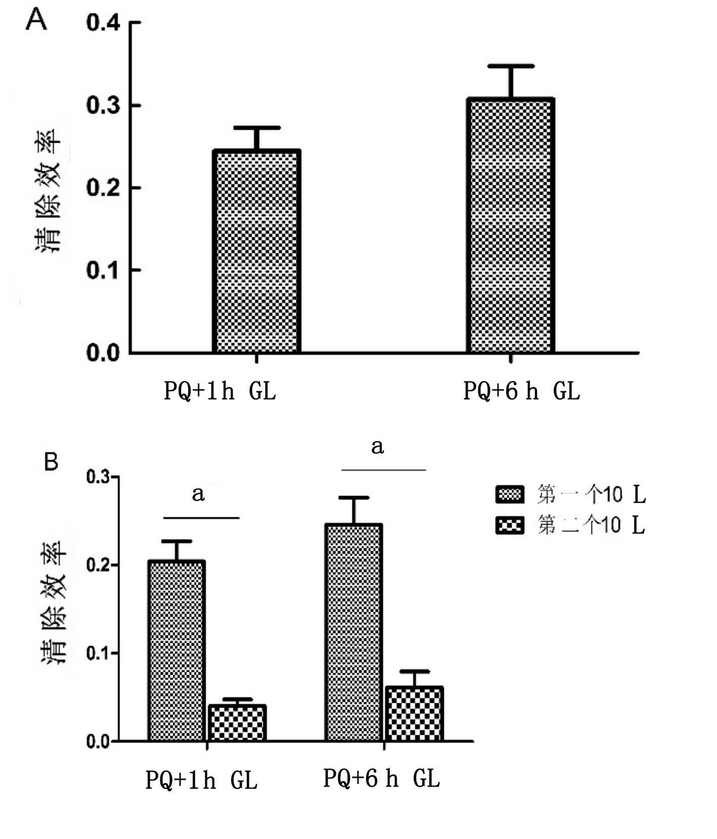 本研究中1 h洗胃组在2 h血浆PQ浓度达峰值,且各时间点的血药浓度较其他两组均明显降低。6 h洗胃组和GL组的峰浓度均出现在8 h左右,两者在2、4、6、8、12 h各点差异均无统计学意义,仅在24 h时6 h洗胃组的血浆PQ浓度低于PQ组。说明1 h洗胃可降低血浓度。但是滞后至6 h洗胃则不能有效降低染毒早期血PQ浓度,Hart等[9]依据血PQ浓度绘制的百草枯中毒生存曲线提示早期的血浓度的高低决定了患者的预后。因此6 h洗胃对于降低百草枯中毒的病死率价值较小。