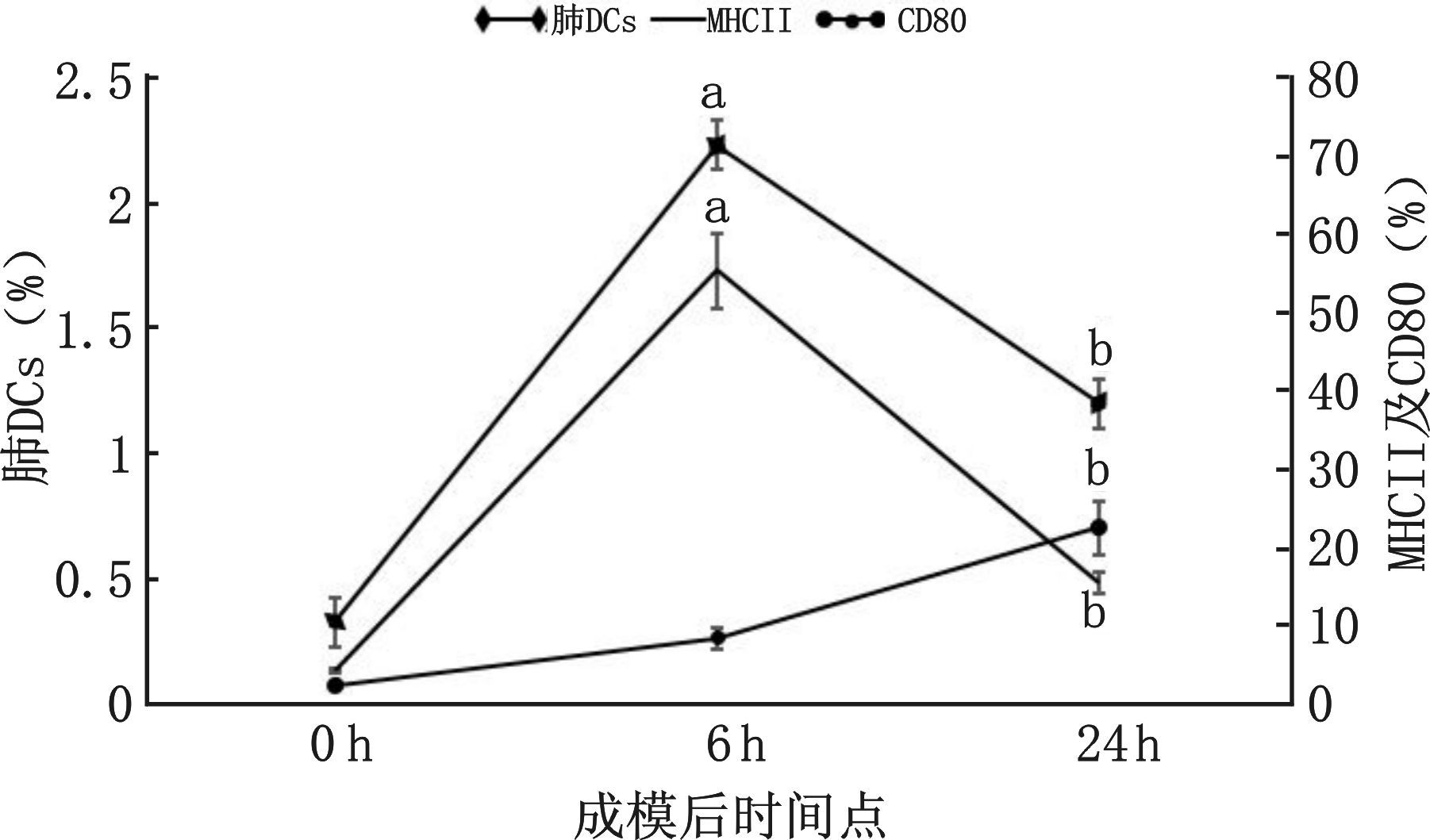 | 与0 h比较,aP<0.05;与6 h比较,bP<0.05 图 1 ALI成模后0 h、6 h及24 h肺cDCs数量、MHCⅡ及CD80表达的动态变化 Figure 1 ynamic changes of accumulation and expression of MHCⅡ and CD80 of cDCs at 0 h,6 h,24h after ALI |