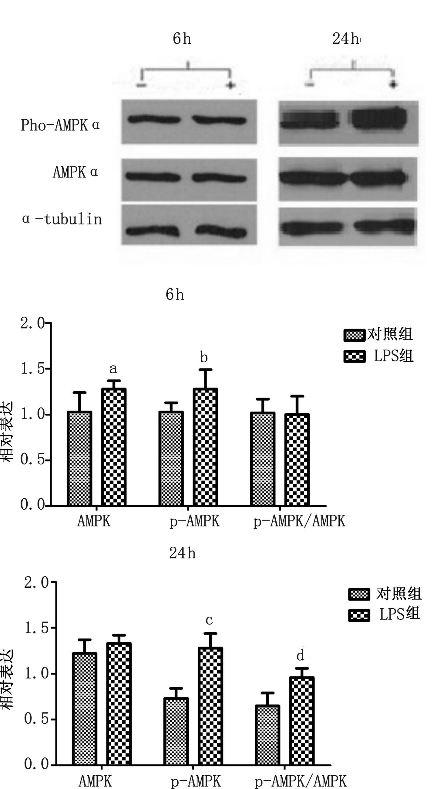 大鼠尾静脉注射LPS 24 h后,AMPK比较对照组差异无统计学意义(P>0.05),p-AMPK比较对照组却有明显上升,差异具有统计学意义(P<0.05),而p-AMPK/AMPK比例比较对照组同样也明显上升,差异具有统计学意义(P<0.05)。见图 3。