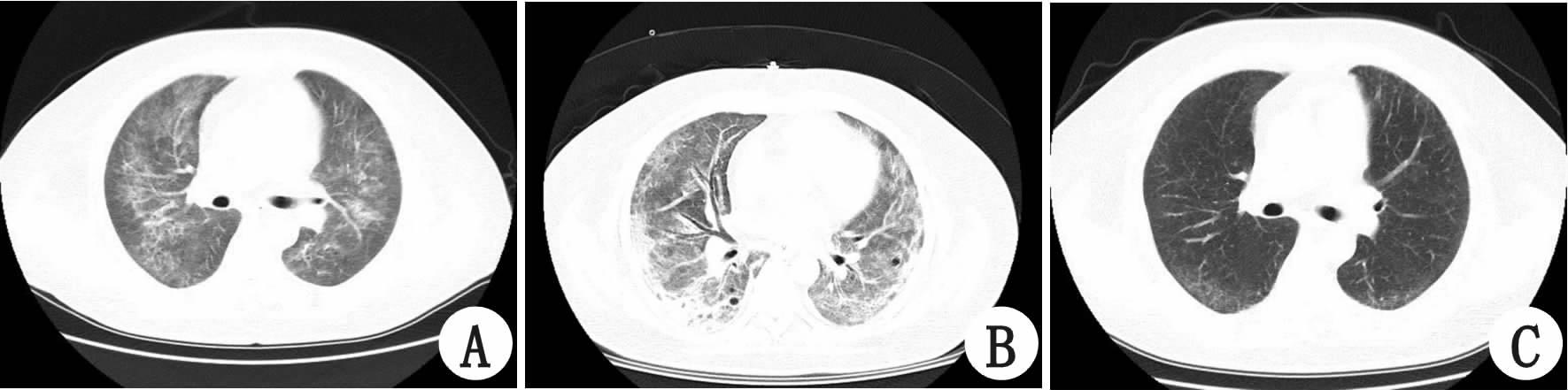 | A:12月16日;B:12月18日;C:1月22日复查 图 1 患者CT结果 |