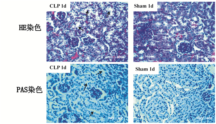 2.3 光镜HE、PAS染色观察CLP术后1 d与假手术组肾组织的病理变化HE和PAS染色显示CLP术后1 d的小鼠肾脏肾小管刷状缘上皮细胞脱落,基底膜暴露,间质炎症细胞浸润,而假手术组改变不明显 (图 3箭头所示)。