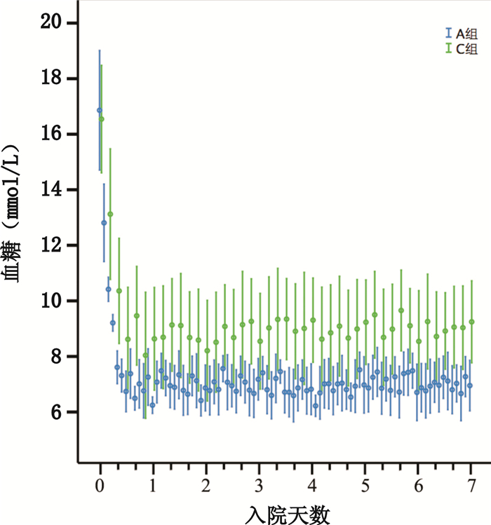 1.2 患者分组与血糖控制方案将入选患者随机 (随机数字法) 分为精准血糖控制 (A) 组和对照 (C) 组,均用胰岛素 (1 U/mL) 持续静脉泵入控制血糖至目标值。A组患者按照危重症患者血糖管理指南要求控制血糖至目标值 (5.56~8.33 mmol/L,不允许出现血糖>10 mmol/L)[7],泵入胰岛素初始速度为0.1 U/(kg·h),根据后续血糖水平,逐渐调整泵入速度;开始阶段测定末梢 (指尖) 血糖1次/h,达到目标血糖后改为1次/2 h;当两次测定血糖变化 > 1 mmol/L时,血糖监测频率恢复为1次/h。C组患者泵入胰岛素控制血糖在 < 11.1 mmol/L水平即可;开始阶段监测末梢 (指尖) 血糖1次/h,达到目标血糖后改为1次/4 h。记录两组患者的不良事件,即低血糖事件的发生时间及次数。低血糖定义为:轻度3.33~3.89 mmol/L,中度2.22~3.32 mmol/L,重度 < 2.22 mmol/L。