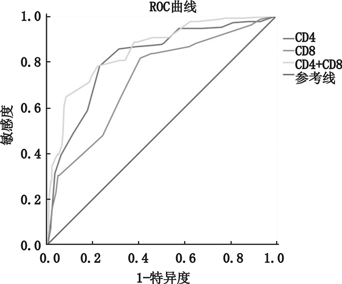 2.6 T淋巴细胞变化对SAI的预测价值以入院当天的CD3+、CD4+、CD8+和CD4+/CD8+及平均血糖作为危险因素对SAI进行logistic回归分析,发现血糖与CD4+ T淋巴细胞计数为SAI的危险因素 (表 4)。CD4+和CD8+ T淋巴细胞计数对SAI诊断效能ROC曲线见图 2。两者曲线下面积 (AUC) 分别为0.814与0.724,截断值 (cut off value) 分别为0.435×109L-1与0.395×109L-1。二者相比,曲线下面积差异无统计学意义 (Z=0.897, P>0.05)。二者联合诊断时的AUC增加至0.890,分别与CD4+和CD8+单独诊断相比,差异具有统计学意义 (vs. CD4+, Z=2.64, P < 0.01; vs. CD8+, Z=3.15, P < 0.01)。