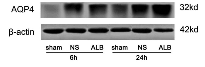 与Sham组相比,其余各组AQP4的表达明显升高,在ALB组6 h中大鼠脑组织水通道相关蛋白AQP4较NS组6 h表达明显增加,同样在ALB组24 h比NS组24 h表达增加。见图 4。