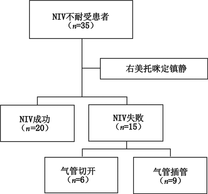 图 1 35例NIV不耐受患者接受右美托咪定镇静后的转归 Figure 1 Outcome of patients of NIV intolerance requiring dexmedetomidine sedation |