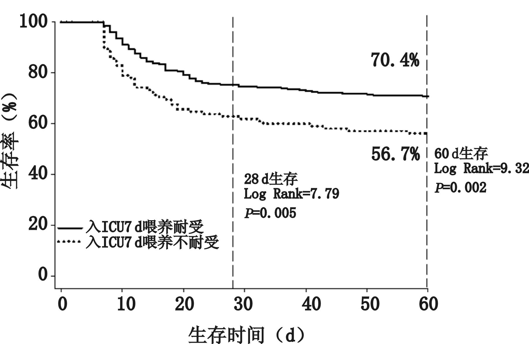 图 1 Kaplan-Meier生存曲线显示重症患者入ICU 7天FI与28 d和60 d生存显著相关。入ICU 7 d喂养耐受患者28 d和60 d生存率分别75.6%和70.4%,显著高于FI患者 (28 d生存率:61.3%;60 d生存率:56.7%,χ2≥7.79, P<0.001)。