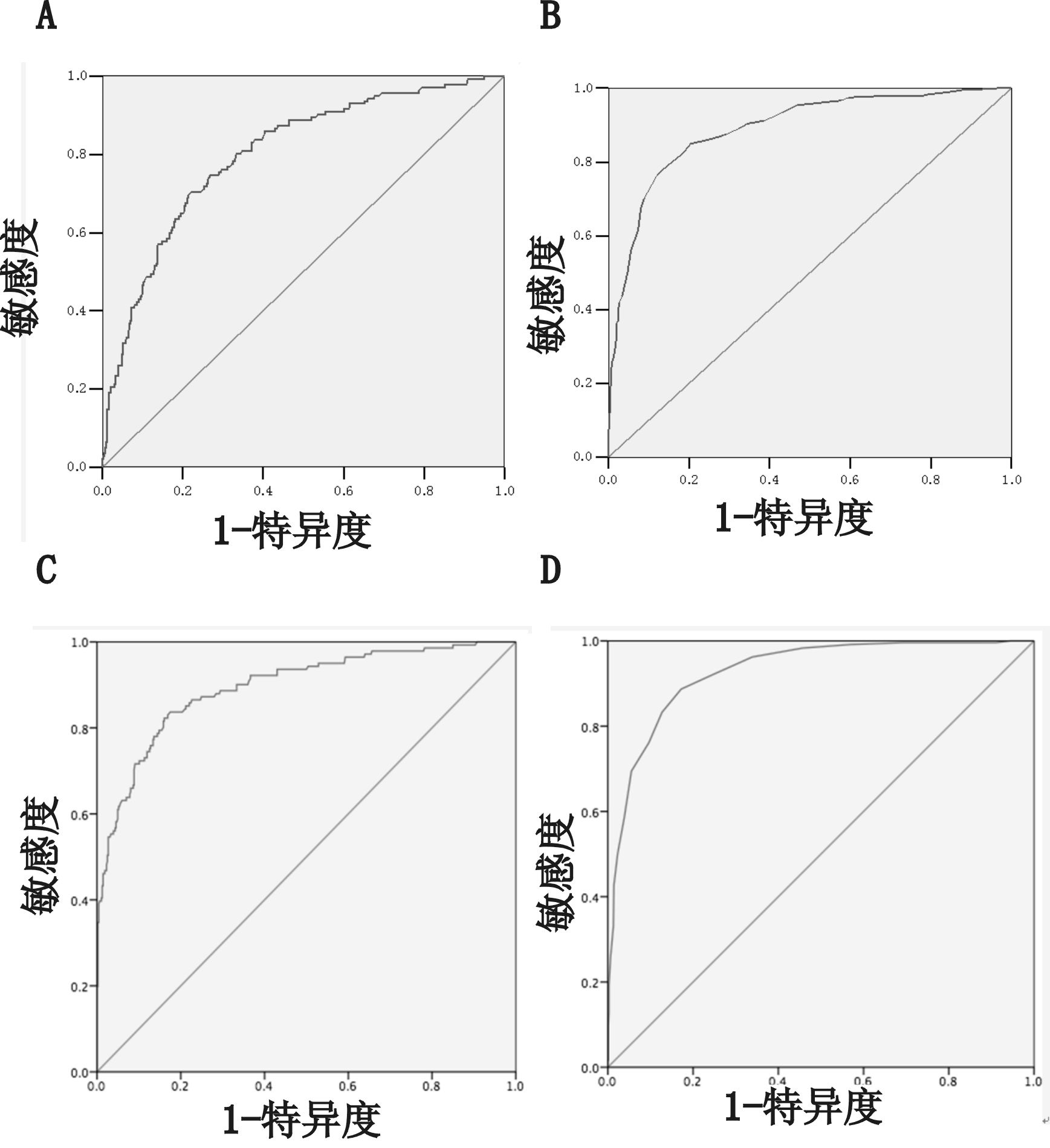 A:D-二聚体,B:APACHE Ⅱ,C:D-二聚体前后差值,D APACHE Ⅱ前后差值 图 1 危重症患者28 d死亡危险诊断的ROC曲线 Figure 1 ROC curve of the risk fait of poor 28 day prognosis |