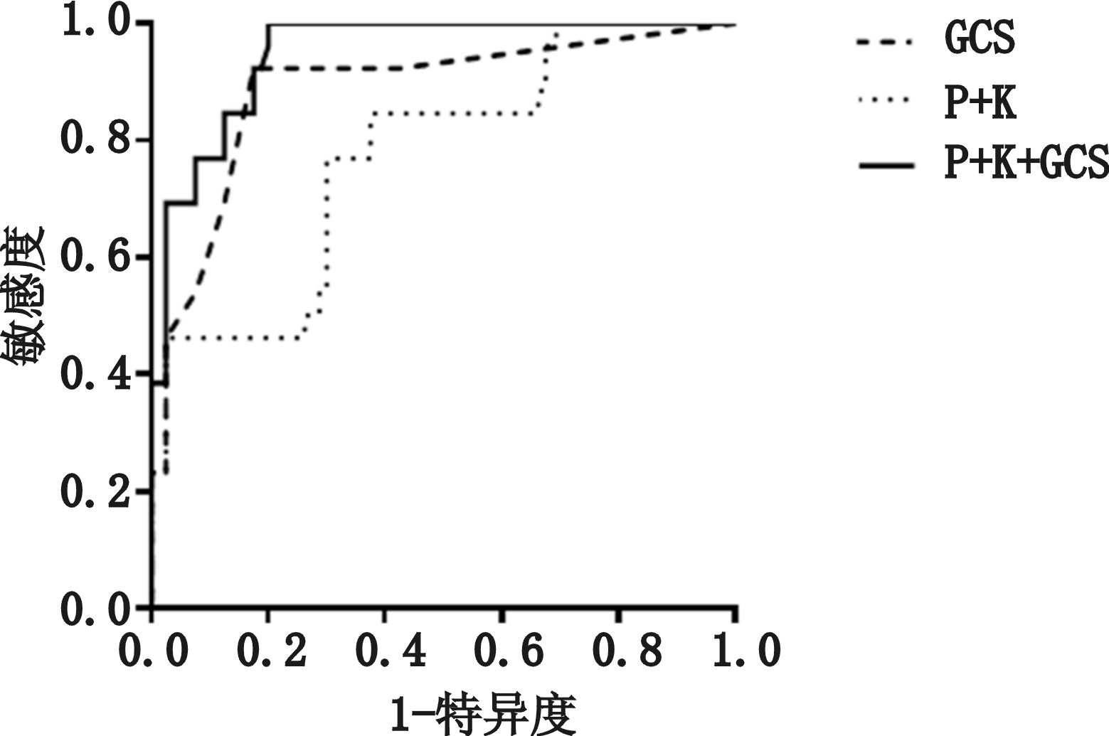 图 1 R+K联合的ROC曲线及P+K+GCS联合的ROC曲线 |