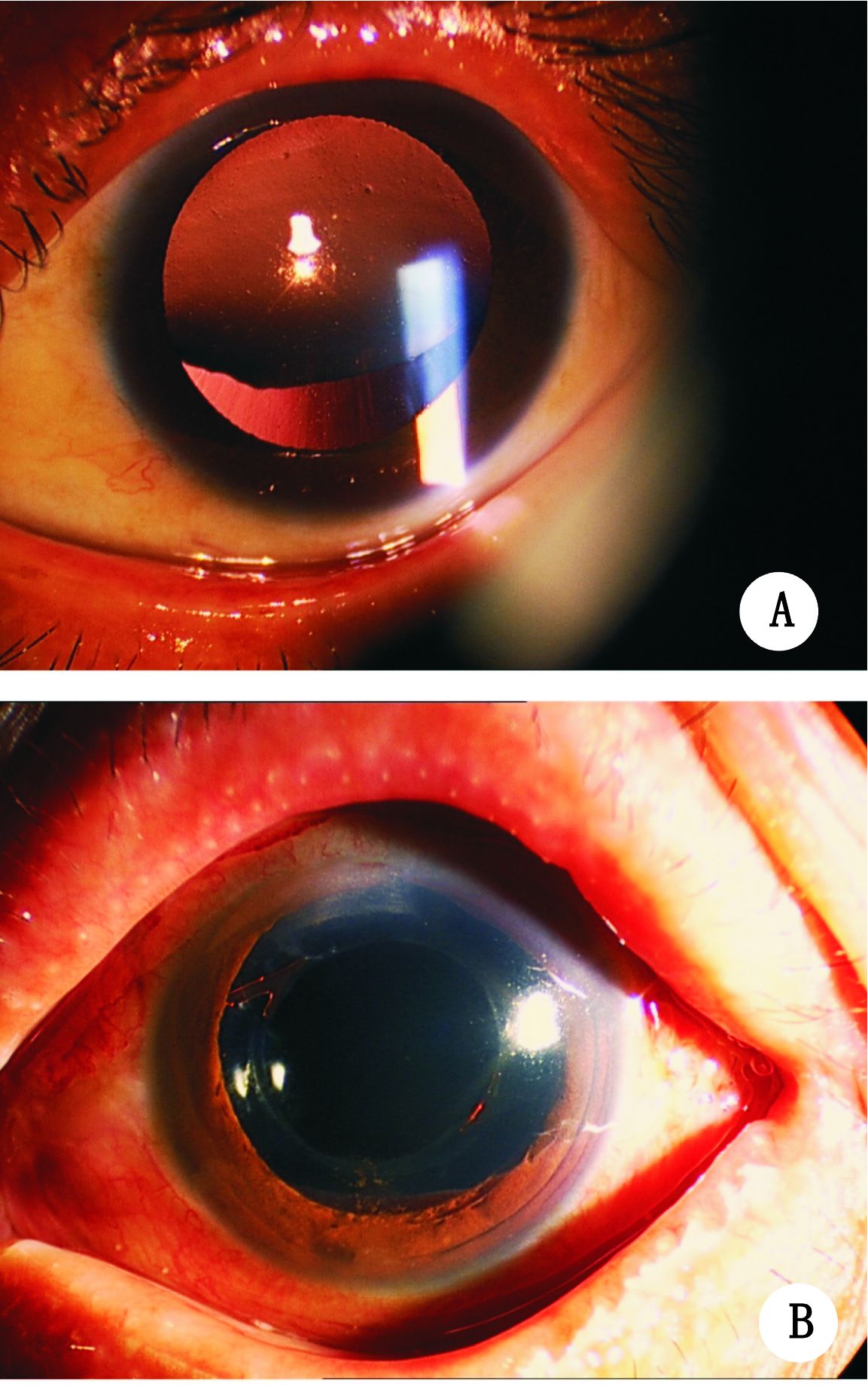 A:术前,B:术后 图 1 晶状体脱位术前术后效果图 |