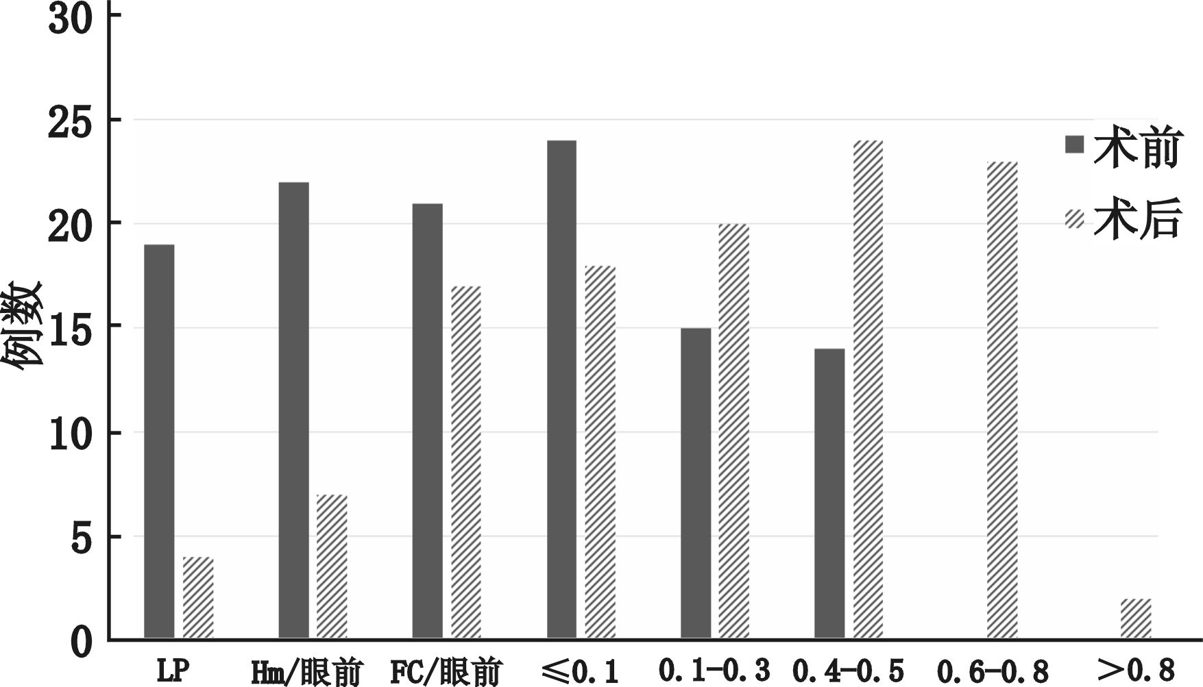 LP-光感;Hm-手动;FL-指数 图 2 术前、术后矫正视力比较 |