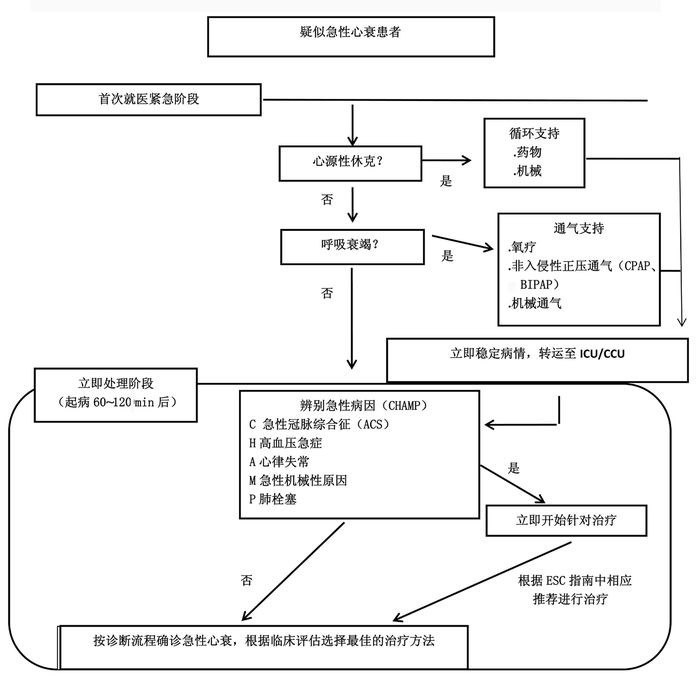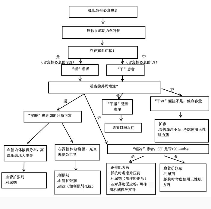 图 2 在急性心衰患者早期阶段根据临床情况处理流程 |