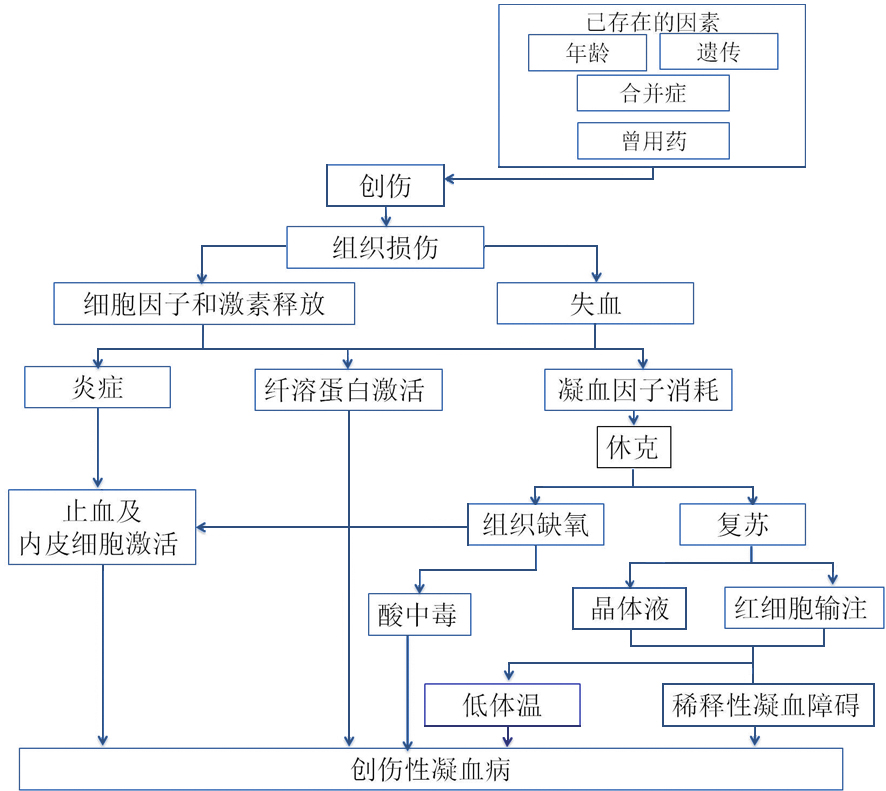 | 图 1 创伤导致凝血功能障碍的发生机制 |