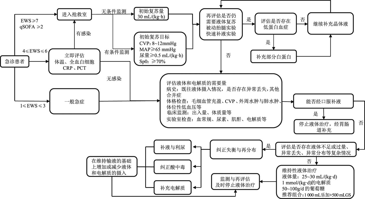(3)病情评估推荐采用qSOFA或NEWS评分,并根据不同的病情轻重定期进行再评估。NEWS在4~6分时,应当进行留观和支持治疗;而NEWS≥7分,则需要密切监护;NEWS≥9分,进抢救室进行全方位抢救支持。