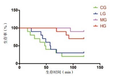 MG和HG的中位生存时间均大于CG和LG(MG vs. CG χ2=11.62. P=0.001;MG vs. LG χ2=8.521, P=0.004;HG vs. CG χ2=8.010, P=0.005;HG vs. LG χ2=5.137, P=0.023)(均P < 0.05),生存曲线差异有统计学意义,MG和HG的生存率大于CG和LG的家兔。MG和HG家兔生存曲线比较(χ2=1.385, P=0.239),生存率差异无统计学意义(图 1)。