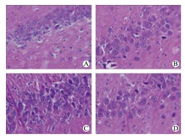 | A: CG组; B: LG组; C: MG组; D: HG组 图 2 四组家兔大脑海马区组织HE染色(HE×400) Figure 2 HE staining of rabbit brain hippocampus tissue in four groups(HE×400) |