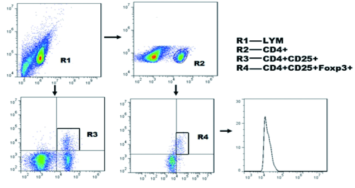 | R1:淋巴细胞;R2: CD4+T细胞;R3: CD4+CD25+T细胞;R4: CD4+CD25+Foxp3+T细胞 图 1 细胞分群 Figure 1 Cell division |