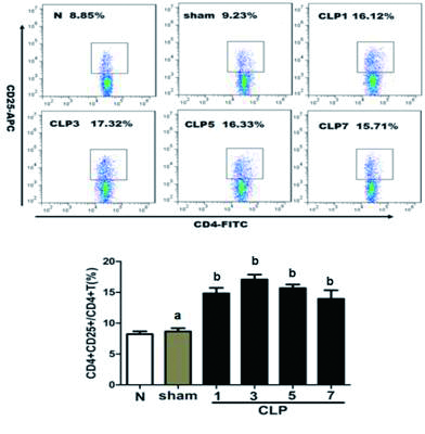 | 与正常组比较,aP > 0.05,与假手术组比较,bP < 0.05 图 2 脓毒症小鼠脾脏CD4+CD25+T/CD4+T细胞的比例 Figure 2 The percentages of splenic Tregs(CD4+CD25+/CD4+T) in septic mice |