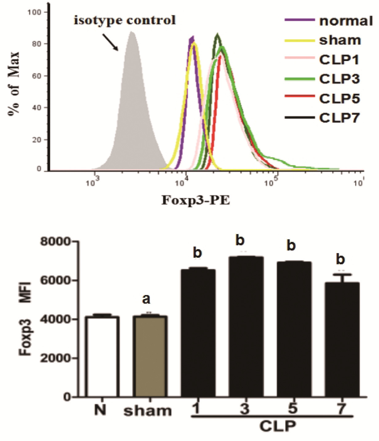 | 与正常组比较,aP > 0.05;与假手术组比较,bP < 0.05 图 3 脓毒症小鼠脾脏Treg中Foxp3的表达 Figure 3 The expression of Foxp3 on splenic Treg in septic mice |