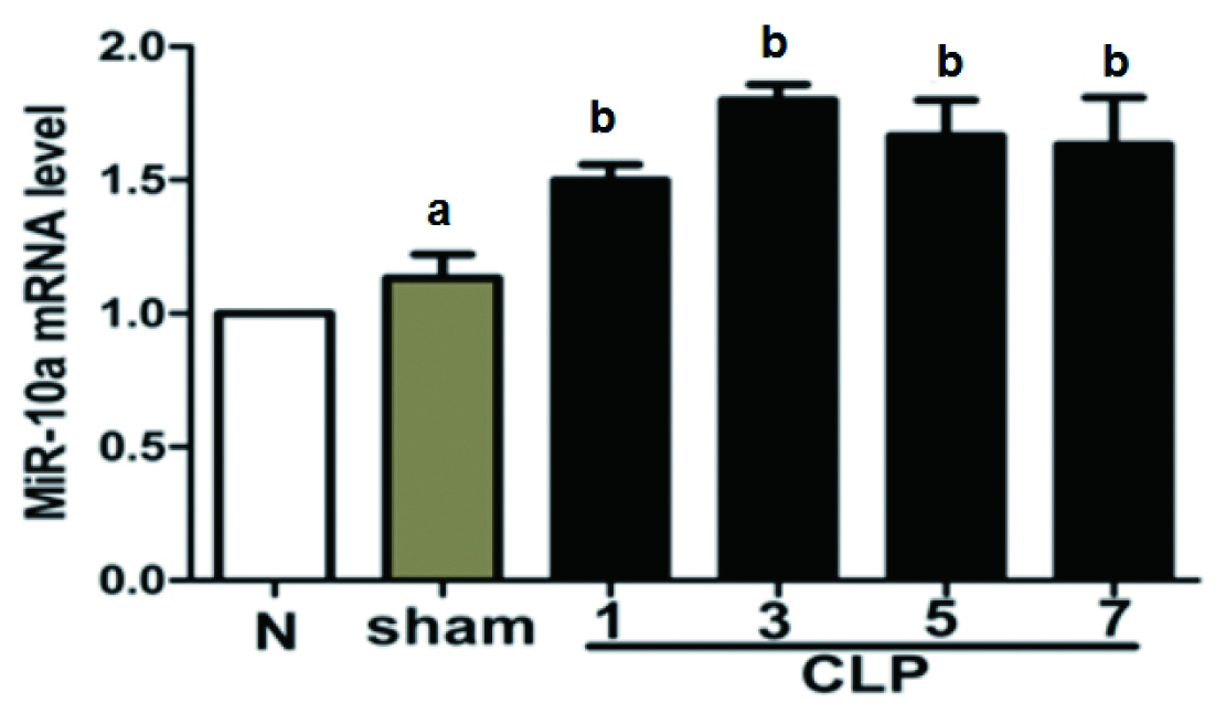 | 与正常组比较,aP > 0.05,与假手术组比较,bP < 0.05 图 5 脓毒症小鼠脾脏CD4+CD25+Treg细胞miR-10a的表达 Figure 5 The expression of miR-10a on splenic CD4+CD25+Treg in septic mice |
