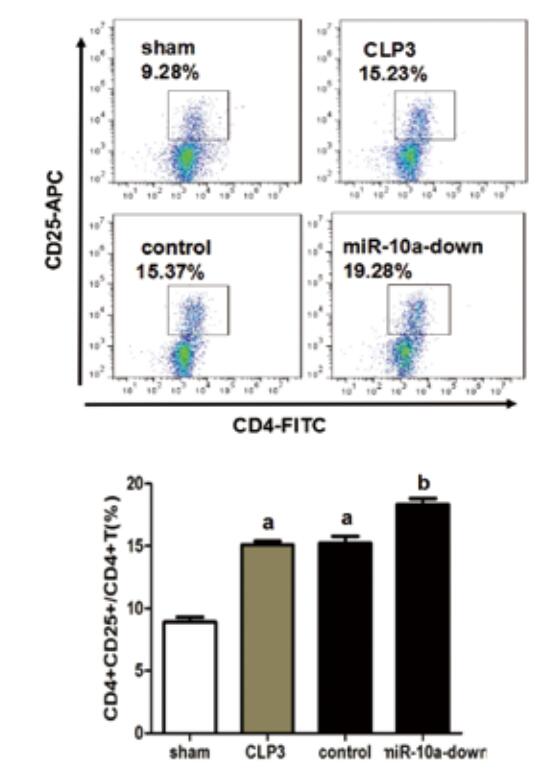 | 与假手术组比较,aP < 0.05,与对照组比较,bP < 0.05 图 7 脓毒症小鼠下调miR-10a后小鼠脾脏CD4+CD25+T/CD4+T细胞的比例 Figure 7 The percentages of splenic Tregs(CD4+CD25+T/CD4+T) in septic mice after down-regulation of miR-10a |
