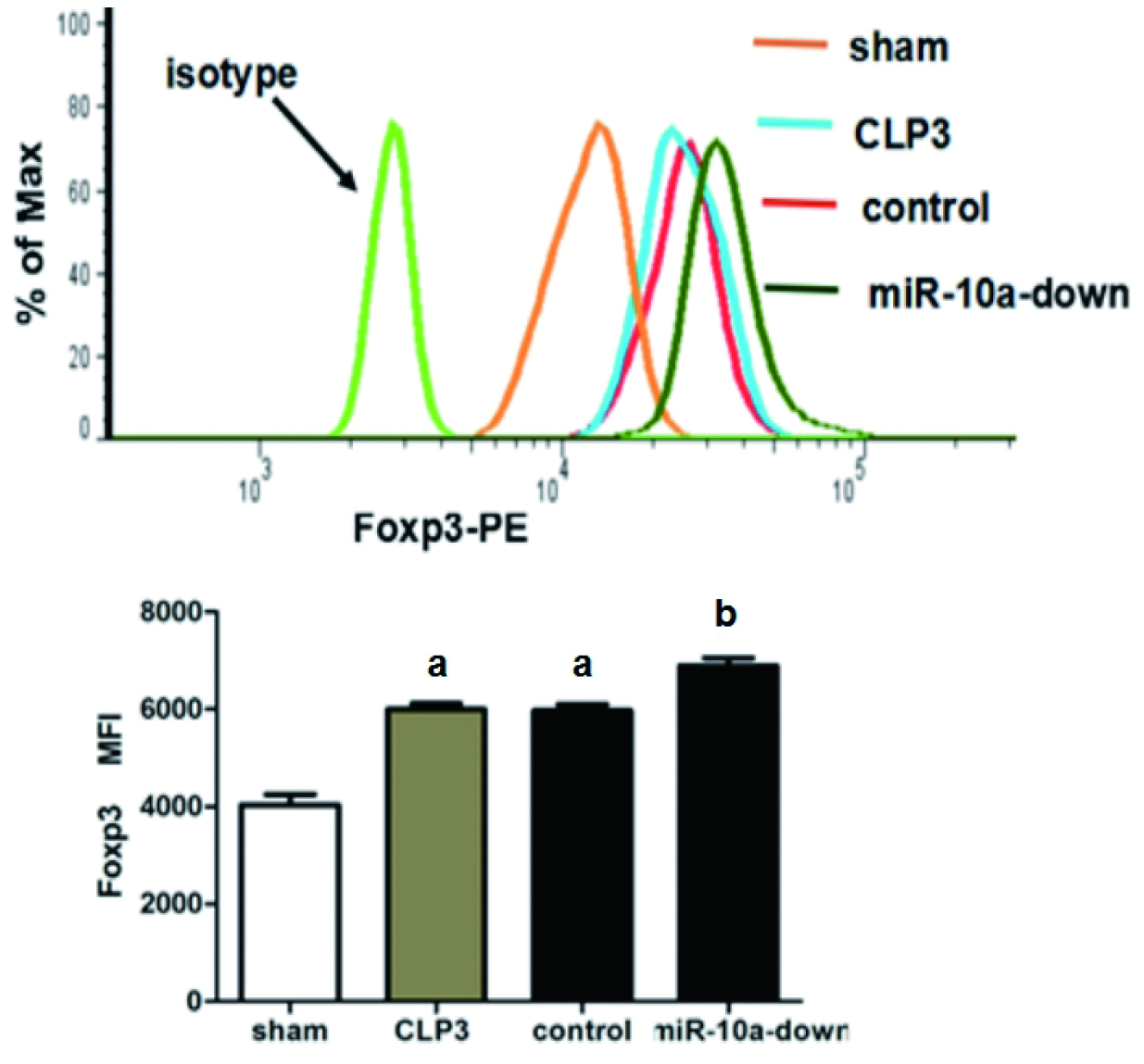 | 与假手术组比较,aP < 0.05,与对照组比较,bP < 0.05 图 8 脓毒症小鼠下调miR-10a后小鼠脾脏CD4+CD25+Treg中Foxp3的表达 Figure 8 The expression of Foxp3 on splenic CD4+CD25+Treg in septic mice after down-regulation of miR-10a |