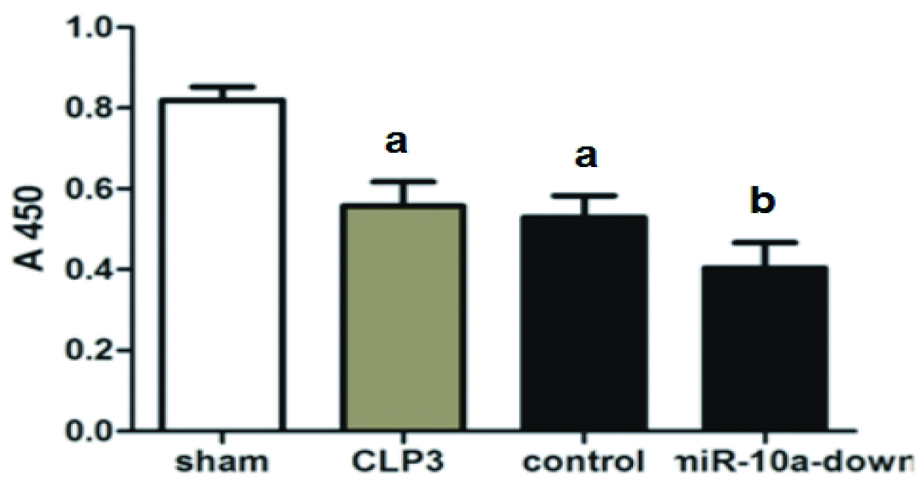 | 与假手术组比较,aP < 0.05,与对照组比较,bP < 0.05 图 9 下调miR-10a对脓毒症小鼠CD4+T细胞增殖的影响 Figure 9 Effects of down-regulation of miR-10a on CD4+T cell proliferative activity in septic mice |