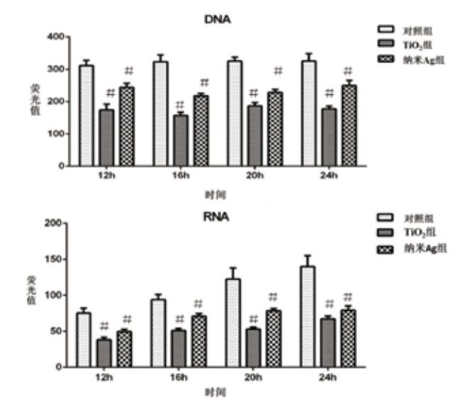 | 图 2 纳米Ag和TiO2作用金黄色葡萄球菌后菌体内DNA、RNA荧光值 Figure 2 DNA and RNA content of staphylococcus aureus treated with nano Ag and TiO2 |