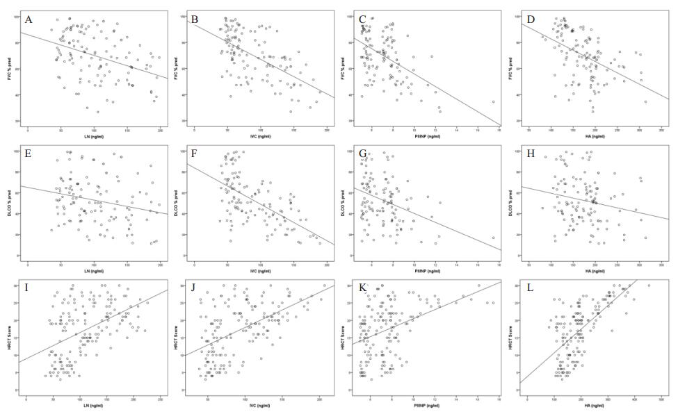 1.6 统计学方法使用SPSS 16.0进行统计,计量资料以均数±标准差(x±s)表示,组间比较成组t检验,对LN、Ⅳ C、P Ⅲ NP、HA与FVC % pred、DLCO % pred、胸部HRCT评分的关系用Bivariate Pearson法进行线性相关分析。以P < 0.05为差异有统计学意义。