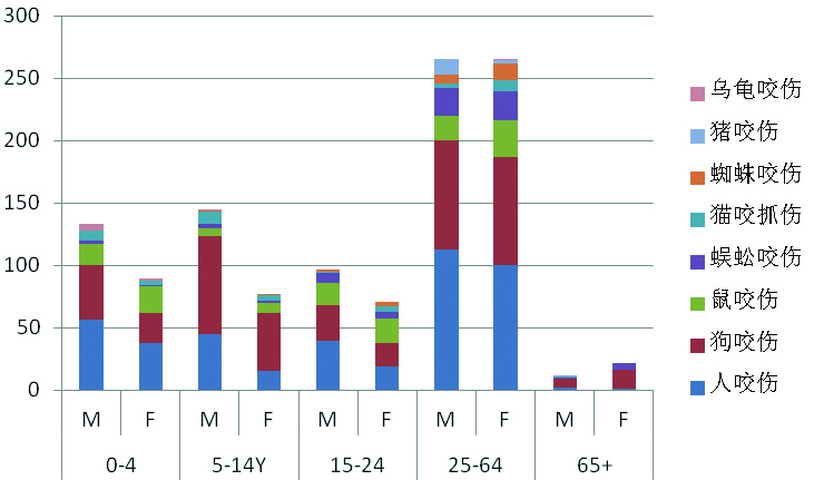 除鼠咬伤组外均男性居多,咬伤总数男女比例1.24:1。原因可能与男性易冒险,喜爱逗玩动物有关。人咬伤患者男性也居多,回顾分析施暴者女性居多,常为男患用手指骂泄愤时被女性施暴者咬伤所致。而鼠咬伤多发生于睡眠中,男女暴露应无差别,但本研究中女性患者居多(男女比例0.81:1),可能与女性爱吃零食,手指及口唇颜面部残留食物残渣吸引老鼠觅食所致。且女性颜面及手部皮肤薄,受伤较男性相对较重,故伤后就医者较男性居多是另一原因。各年龄段均有发病,发病最小为4个月,最大为103岁。各年龄段咬伤意外伤害分布中虽25~64岁成年组最常见,但0~4岁组人群中狗咬伤(15.56%)、人咬伤(21.96%)、鼠咬伤(27.33%)构成比皆不低,值得卫生防疫部门及临床医生对婴幼儿咬伤伤害的关注,改善婴幼儿居住卫生条件,同时加强对婴幼儿监护者的安全宣教。