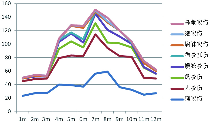 动物致伤4~10月份最多,883例,(75.09%),7~9月为高峰,435例(36.99%);近5年来以2012年发病最低,192例(16.33%);发病最高是2014年为266例(22.62%),近两年有所下降,见图 3。