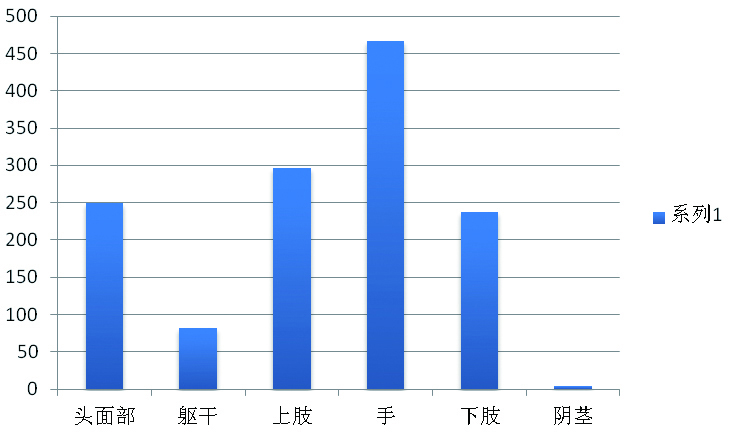 动物咬伤共1176例,1336处。其中狗、鼠、猪咬伤为多处,狗咬伤438例/589处;鼠咬伤139例/149处;猪咬伤14例/20处。咬伤部位中手部最多,共466处(占34.88%),其次是上肢22.23%和头面部18.31%,躯干最少6.14%,另有4例阴茎咬伤,见图 4,5。