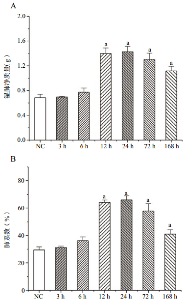 2.2 PFIB染毒对大鼠肺系数的影响在PFIB暴露后6 h,即可观察到湿肺质量较健康对照组明显升高,并持续升高至染毒后72 h,在暴露后168 h有所回落(图 1A);肺系数的变化与肺质量的变化规律一致(图 1B)。