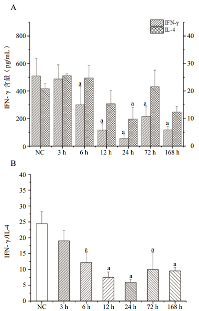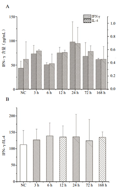 在PFIB暴露后,血浆中IFN-γ含量进行性升高,至暴露后24 h达峰,其后缓慢降低至染毒后168 h,基本恢复至正常水平(图 3A)。这一变化与前述肺损伤(肺质量、肺系数、BALF的蛋白质和磷脂含量)严重程度的变化在时间上相吻合。而血浆中的IL-4含量极低,变化较小(图 3B),因此IFN-γ/IL-4的平衡关系主要以IFN-γ变化为主。