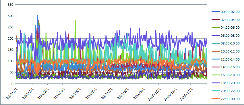 | 图 2 2016年上海某三甲医院急诊科就诊人次数各时间段分布 Figure 2 The distribution of patients in different periods in a Shanghai 3rd Grade Class A hospital in 2016 |