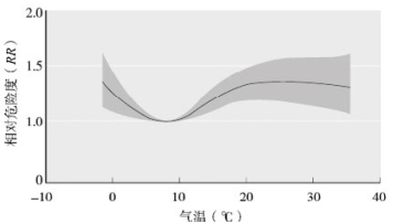 上述分析采用R 3.3.3软件进行,准泊松广义相加模型和分布滞后非线性模型采用DLNM程序包予以建立,通过模型估计急诊就诊风险最低的适宜温度,计算得出最低与最高温度相比适宜温度的相对危险度(RR),并观察在不同滞后天数的效应下,急诊就诊相对危险度的变化。利用splines程序包拟合暴露反应关系。最后经过对数转换,分析气温变化对急诊就诊量的影响。