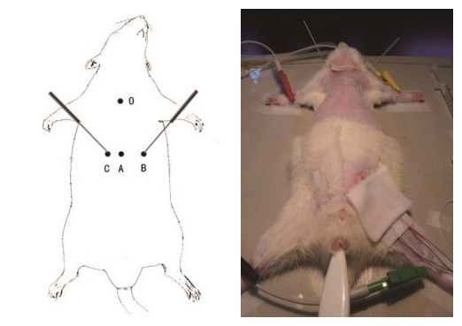 1.2.2 刺激电极的置入用无菌针灸针(环球牌0.25 mm×40 mm,苏州针灸用品有限公司,中国)作为导电极,针灸针经胸壁刺入到达心外膜。大鼠的胸壁肌层较厚,肋骨相对难以触及,骨性标志不甚明显,导电极难以透过胸壁准确到达心外膜上,鉴于此本研究根据大鼠的解剖特点,对330~380 g SD大鼠进行了定量化的定位导电极刺入点。在大鼠的前正中线上以胸骨顶端为零点O,向下定位3.2 cm的点A;再以A点为零点,向左定位0.9 cm的点B,向右定位0.5 cm的点C。则B、C两点即为针灸针刺入的点,进针深度约1~1.5 cm, 在B点进针时针灸针与水平线约呈75°角,针尖指向前正中线;在C点进针时针灸针与水平线约呈60°角,针尖指向前正中线,见图 1。刺入后,针尖到达心外膜上可见针尾的快速摆动且与大鼠心脏跳动的频率一致;心电图可有早搏,短暂室性心律失常等改变;同时有血压波形的瞬时下落,随即血压即可回升至基础值。完成上述操作后持续观察动物基础状态30 min。