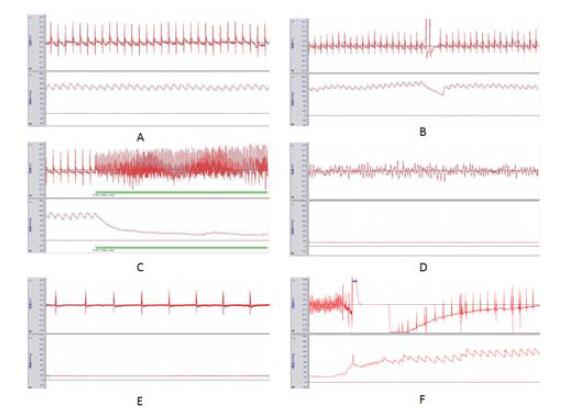 | A:诱颤前的基础生理参数;B:针灸针刺入心外膜时;C:给予电刺激诱发CA;D:刺激结束后心电图示室颤;E:刺激结束后心电图示无脉性电活动;F:给予除颤后 图 2 实验大鼠致颤与复苏过程中的心电及血压波形变化 Figure 2 The ECG and blood pressure waveform during cardiac arrest and CPR |