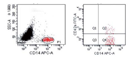 FACSCalibur型流式细胞仪(美国Becton Dickinson公司), 离心机(美国Bio-Rad公司), 涡旋混合器(常州市国立试验设备研究所), 移液枪及排枪(德国Eppendorf公司), 鼠抗人CDl4-APC、同型对照IgG1-APC, 鼠抗人CD42a-FITC、同型对照IgG2b-FITC(美国Becton Dickinson公司), PBS缓冲液(上海书吉生物科技有限公司), 血浆IL-6检测试剂盒(上海恒远生物科技有限公司)。