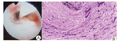 病例2, 患儿, 女, 2岁4个月, 因“发热咳嗽4 d, 气促声嘶3 d”于2017年3月14日入院。3 d前进食橡皮软糖后出现气促及咳嗽加重。既往体健。入院查体:T 37.0℃, P 172次/min, R 46次/min, BP 117/52 mmHg, 烦躁不安, 呼吸促, 三凹征明显, 张口呼吸, 双肺呼吸音低, 可闻及少许干啰音, 心音中, 腹软。立即予气管插管接呼吸机辅助通气, 患儿气道峰压高明显, 行纤维喉镜检查提示气道黄色黏液样物质, 难以取出, 遂立即行纤维支气管镜检查, 镜下见黄色黏性物质堵塞气道, 冲洗干净后, 见气管支气管黏膜红肿, 局部发白, 可见大量黏液条索状物质(图 2A)。纤支镜病理提示(灌洗物)炎性坏死组织, 多量脓细胞。肺部灌洗液样品与可疑呼吸道异物样品红外图谱对比提示呼吸道异物为橡皮软糖可能性大。诊断:急性假膜性坏死性喉气管支气管炎, 呼吸道异物。入院后查血常规提示白细胞计数9.81×109/L, 中性粒细胞86.4%, 超敏C反应蛋白82 mg/L, 多次纤支镜灌洗液培养均提示甲氧西林敏感金黄色葡萄球菌, 痰及灌洗液呼吸道病毒检测提示流感A病毒阳性, 复查纤支镜病理提示(支气管)片状炎性纤维素样坏死渗出物(可符合假膜性喉支气管炎)(图 2B), 入院前胸部CT提示左主支气管显示不清, 右肺中叶肺炎伴不张, 入院后复查胸部CT提示右肺少量炎症性改变, 以右肺上叶为著。患儿入院后予气管插管呼吸机辅助通气, 吸痰清理呼吸道, 多次纤维支气管镜检查及冲洗, 并予奥司他韦抗病毒, 美罗培南、利奈唑胺抗感染, 甲泼尼龙抗炎, 雾化加强呼吸道护理等治疗。住院期间亦突发气道堵塞, 予心肺复苏抢救, 直接喉镜下夹取约2 cm×0.3 cm痰栓样物质, 之后纤支镜冲洗清除干净。住院期间患儿受损气道黏膜逐步愈合, 咳嗽缓解, 声嘶好转, 1个月后顺利出院。